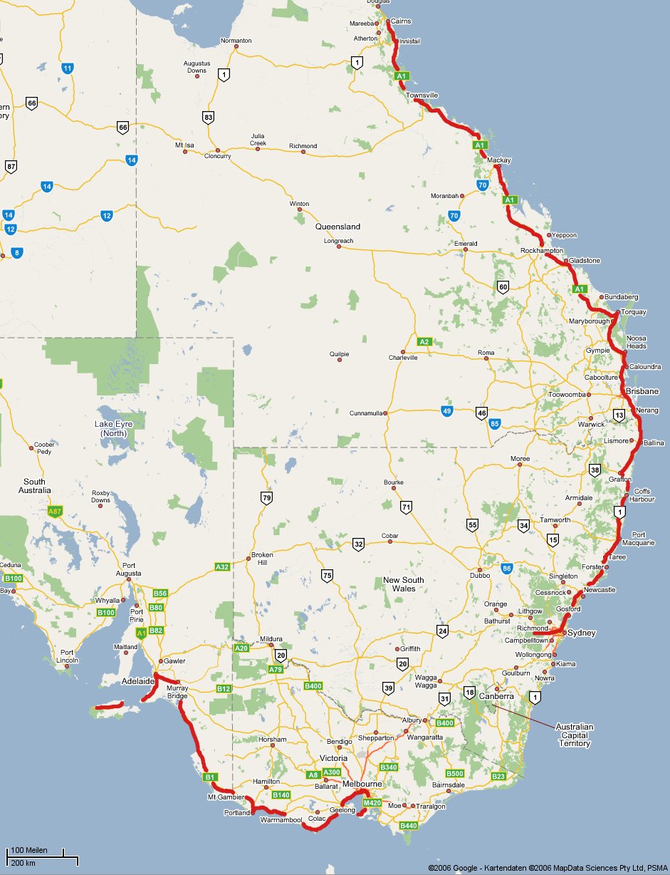 Diese Karte zeigt unseren geplanten Weg in Australien.